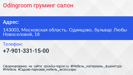 Odingroom, груминг-салон по адресу 143003, Московская область, Одинцово, бульвар Любы Новоселовой, 18 в дальнейшем Организация, размещена в следующих категориях: