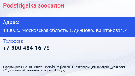 Podstrigalka, зоосалон по адресу 143006, Московская область, Одинцово, Каштановая, 4 в дальнейшем Организация, размещена в следующих категориях: