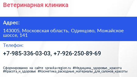 Ветеринарная клиника по адресу 143005, Московская область, Одинцово, Можайское шоссе, 141 в дальнейшем Организация, размещена в следующих категориях: