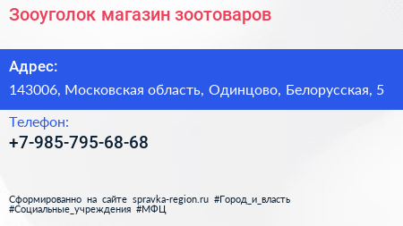 Зооуголок, магазин зоотоваров по адресу 143006, Московская область, Одинцово, Белорусская, 5 в дальнейшем Организация, размещена в следующих категориях: