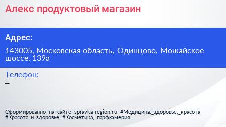 Алекс, продуктовый магазин по адресу 143005, Московская область, Одинцово, Можайское шоссе, 139а в дальнейшем Организация, размещена в следующих категориях: