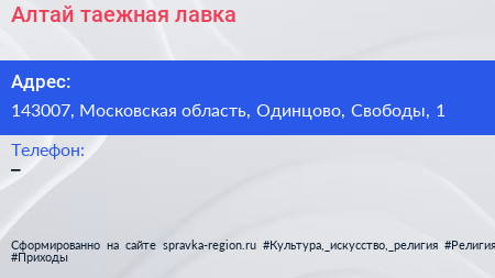 Алтай, таежная лавка по адресу 143007, Московская область, Одинцово, Свободы, 1 в дальнейшем Организация, размещена в следующих категориях: