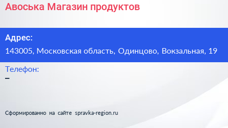 Авоська, Магазин продуктов по адресу 143005, Московская область, Одинцово, Вокзальная, 19 в дальнейшем Организация, размещена в следующих категориях: