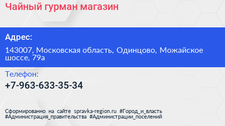 Чайный гурман, магазин по адресу 143007, Московская область, Одинцово, Можайское шоссе, 79а в дальнейшем Организация, размещена в следующих категориях: