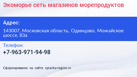 Экоморье, сеть магазинов морепродуктов по адресу 143007, Московская область, Одинцово, Можайское шоссе, 83а в дальнейшем Организация, размещена в следующих категориях: