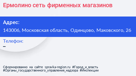 Ермолино, сеть фирменных магазинов по адресу 143006, Московская область, Одинцово, Маковского, 26 в дальнейшем Организация, размещена в следующих категориях: