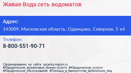 Живая Вода, сеть водоматов по адресу 143009, Московская область, Одинцово, Северная, 5 к4 в дальнейшем Организация, размещена в следующих категориях: