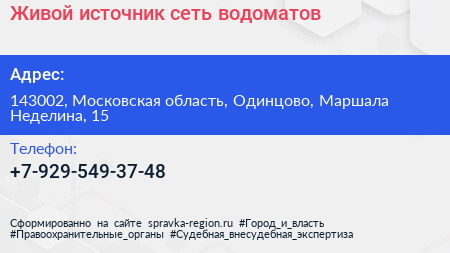 Живой источник, сеть водоматов по адресу 143002, Московская область, Одинцово, Маршала Неделина, 15 в дальнейшем Организация, размещена в следующих категориях: