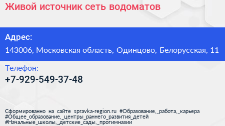 Живой источник, сеть водоматов по адресу 143006, Московская область, Одинцово, Белорусская, 11 в дальнейшем Организация, размещена в следующих категориях: