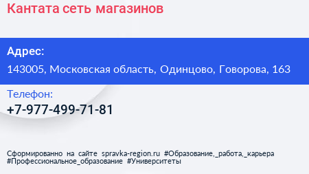 Кантата, сеть магазинов по адресу 143005, Московская область, Одинцово, Говорова, 163 в дальнейшем Организация, размещена в следующих категориях: