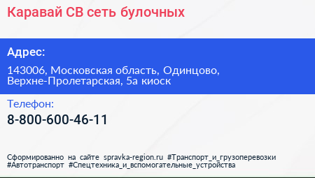 Каравай СВ, сеть булочных по адресу 143006, Московская область, Одинцово, Верхне-Пролетарская, 5а киоск в дальнейшем Организация, размещена в следующих категориях: