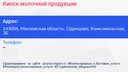 Киоск молочной продукции по адресу 143006, Московская область, Одинцово, Комсомольская, 3Б в дальнейшем Организация, размещена в следующих категориях:
