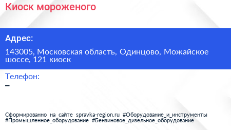 Киоск мороженого по адресу 143005, Московская область, Одинцово, Можайское шоссе, 121 киоск в дальнейшем Организация, размещена в следующих категориях: