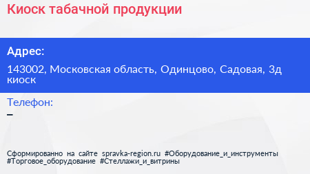 Киоск табачной продукции по адресу 143002, Московская область, Одинцово, Садовая, 3д киоск в дальнейшем Организация, размещена в следующих категориях: