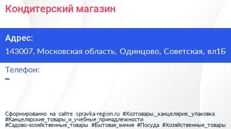 Кондитерский магазин по адресу 143007, Московская область, Одинцово, Советская, вл1Б в дальнейшем Организация, размещена в следующих категориях: