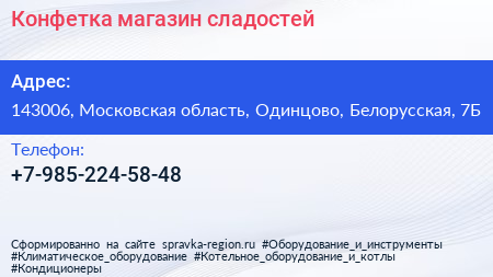 Конфетка, магазин сладостей по адресу 143006, Московская область, Одинцово, Белорусская, 7Б в дальнейшем Организация, размещена в следующих категориях: