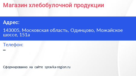 Магазин хлебобулочной продукции по адресу 143005, Московская область, Одинцово, Можайское шоссе, 151а в дальнейшем Организация, размещена в следующих категориях: