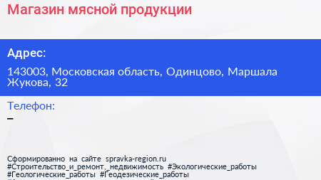 Магазин мясной продукции по адресу 143003, Московская область, Одинцово, Маршала Жукова, 32 в дальнейшем Организация, размещена в следующих категориях: