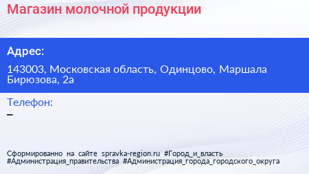 Магазин молочной продукции по адресу 143003, Московская область, Одинцово, Маршала Бирюзова, 2а в дальнейшем Организация, размещена в следующих категориях: