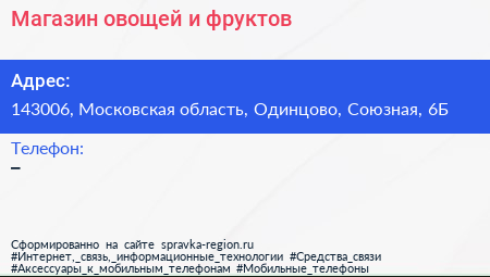 Магазин овощей и фруктов по адресу 143006, Московская область, Одинцово, Союзная, 6Б в дальнейшем Организация, размещена в следующих категориях: