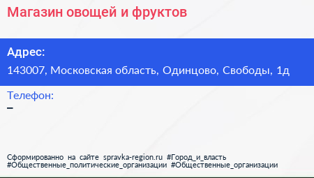 Магазин овощей и фруктов по адресу 143007, Московская область, Одинцово, Свободы, 1д в дальнейшем Организация, размещена в следующих категориях: