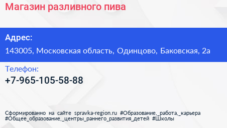 Магазин разливного пива по адресу 143005, Московская область, Одинцово, Баковская, 2а в дальнейшем Организация, размещена в следующих категориях: