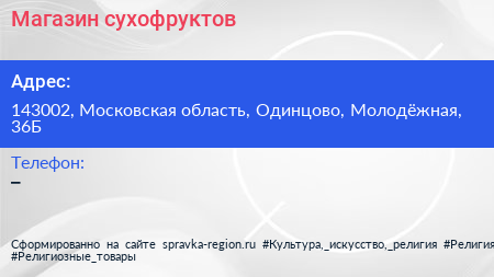 Магазин сухофруктов по адресу 143002, Московская область, Одинцово, Молодёжная, 36Б в дальнейшем Организация, размещена в следующих категориях: