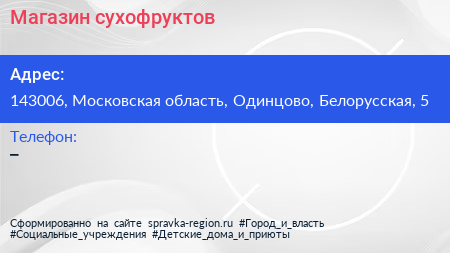 Магазин сухофруктов по адресу 143006, Московская область, Одинцово, Белорусская, 5 в дальнейшем Организация, размещена в следующих категориях: