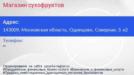 Магазин сухофруктов по адресу 143009, Московская область, Одинцово, Северная, 5 к2 в дальнейшем Организация, размещена в следующих категориях: