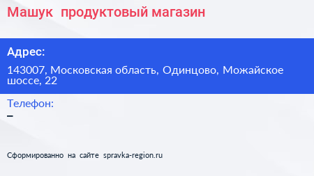Машук+, продуктовый магазин по адресу 143007, Московская область, Одинцово, Можайское шоссе, 22 в дальнейшем Организация, размещена в следующих категориях:
