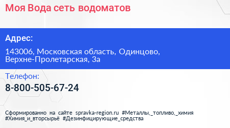 Моя Вода, сеть водоматов по адресу 143006, Московская область, Одинцово, Верхне-Пролетарская, 3а в дальнейшем Организация, размещена в следующих категориях: