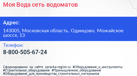 Моя Вода, сеть водоматов по адресу 143005, Московская область, Одинцово, Можайское шоссе, 13 в дальнейшем Организация, размещена в следующих категориях: