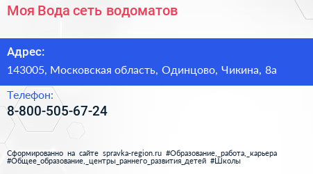 Моя Вода, сеть водоматов по адресу 143005, Московская область, Одинцово, Чикина, 8а в дальнейшем Организация, размещена в следующих категориях:
