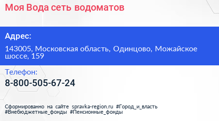 Моя Вода, сеть водоматов по адресу 143005, Московская область, Одинцово, Можайское шоссе, 159 в дальнейшем Организация, размещена в следующих категориях: