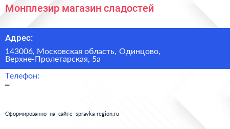 Монплезир, магазин сладостей по адресу 143006, Московская область, Одинцово, Верхне-Пролетарская, 5а в дальнейшем Организация, размещена в следующих категориях:
