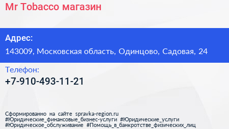Mr.Tobacco, магазин по адресу 143009, Московская область, Одинцово, Садовая, 24 в дальнейшем Организация, размещена в следующих категориях: