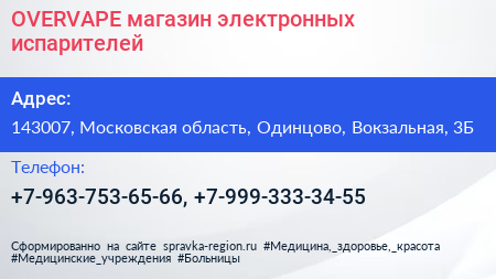 OVERVAPE, магазин электронных испарителей по адресу 143007, Московская область, Одинцово, Вокзальная, 3Б в дальнейшем Организация, размещена в следующих категориях:
