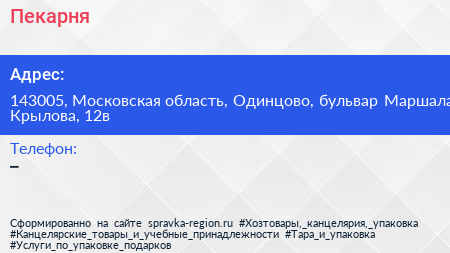 Пекарня по адресу 143005, Московская область, Одинцово, бульвар Маршала Крылова, 12в в дальнейшем Организация, размещена в следующих категориях: