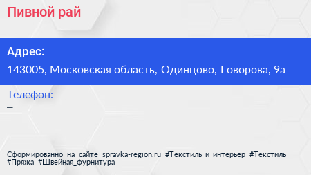 Пивной рай по адресу 143005, Московская область, Одинцово, Говорова, 9а в дальнейшем Организация, размещена в следующих категориях:
