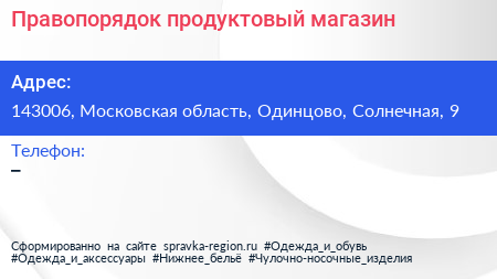 Правопорядок, продуктовый магазин по адресу 143006, Московская область, Одинцово, Солнечная, 9 в дальнейшем Организация, размещена в следующих категориях: