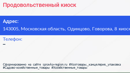 Продовольственный киоск по адресу 143005, Московская область, Одинцово, Говорова, 8 киоск в дальнейшем Организация, размещена в следующих категориях: