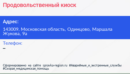 Продовольственный киоск по адресу 143009, Московская область, Одинцово, Маршала Жукова, 9а в дальнейшем Организация, размещена в следующих категориях: