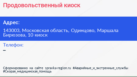 Продовольственный киоск по адресу 143003, Московская область, Одинцово, Маршала Бирюзова, 10 киоск в дальнейшем Организация, размещена в следующих категориях: