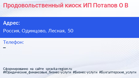 Продовольственный киоск, ИП Потапов О.В. по адресу Поликлиника 3-го филиала ЦВКГ им. А. А. Вишневского, 50, Лесная улица, Школьный микрорайон, Власиха, городской округ Власиха, Московская область, Центральный федеральный округ, 143010, Россия в дальнейшем Организация, размещена в следующих категориях: