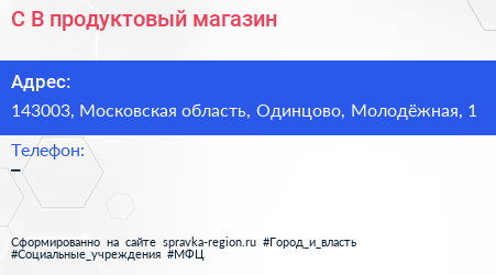 С+В, продуктовый магазин по адресу 143003, Московская область, Одинцово, Молодёжная, 1 в дальнейшем Организация, размещена в следующих категориях: