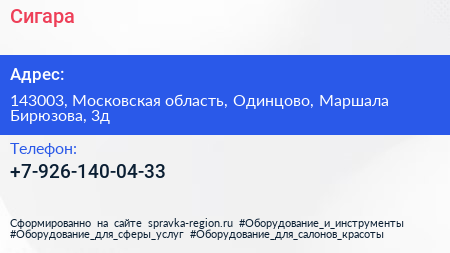 Сигара по адресу 143003, Московская область, Одинцово, Маршала Бирюзова, 3д в дальнейшем Организация, размещена в следующих категориях: