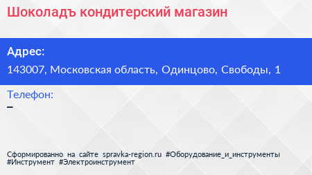 Шоколадъ, кондитерский магазин по адресу 143007, Московская область, Одинцово, Свободы, 1 в дальнейшем Организация, размещена в следующих категориях: