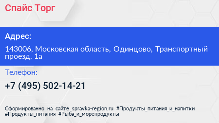 Спайс-Торг по адресу 143006, Московская область, Одинцово, Транспортный проезд, 1а в дальнейшем Организация, размещена в следующих категориях: