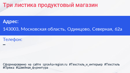 Три листика, продуктовый магазин по адресу 143003, Московская область, Одинцово, Северная, 62а в дальнейшем Организация, размещена в следующих категориях: