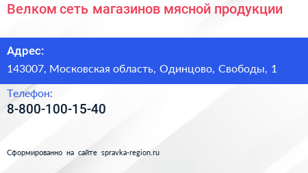 Велком, сеть магазинов мясной продукции по адресу 143007, Московская область, Одинцово, Свободы, 1 в дальнейшем Организация, размещена в следующих категориях: